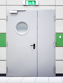 Полуторапольные двери с круглым стеклопакетом имеют предел огнестойкости 60 минут. От обычных технических дверей их отличает присутствие огнестойкого заполнения. Такие двери предназначены для установки на эвакуационных путях в зданиях с массовым пребыванием людей, а также в помещениях, в которых установлено пожароопасное оборудование или хранятся легковоспламеняющиеся вещества.